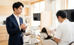 教育体制について先輩歯科医師から説明を受ける若い歯科医師の様子